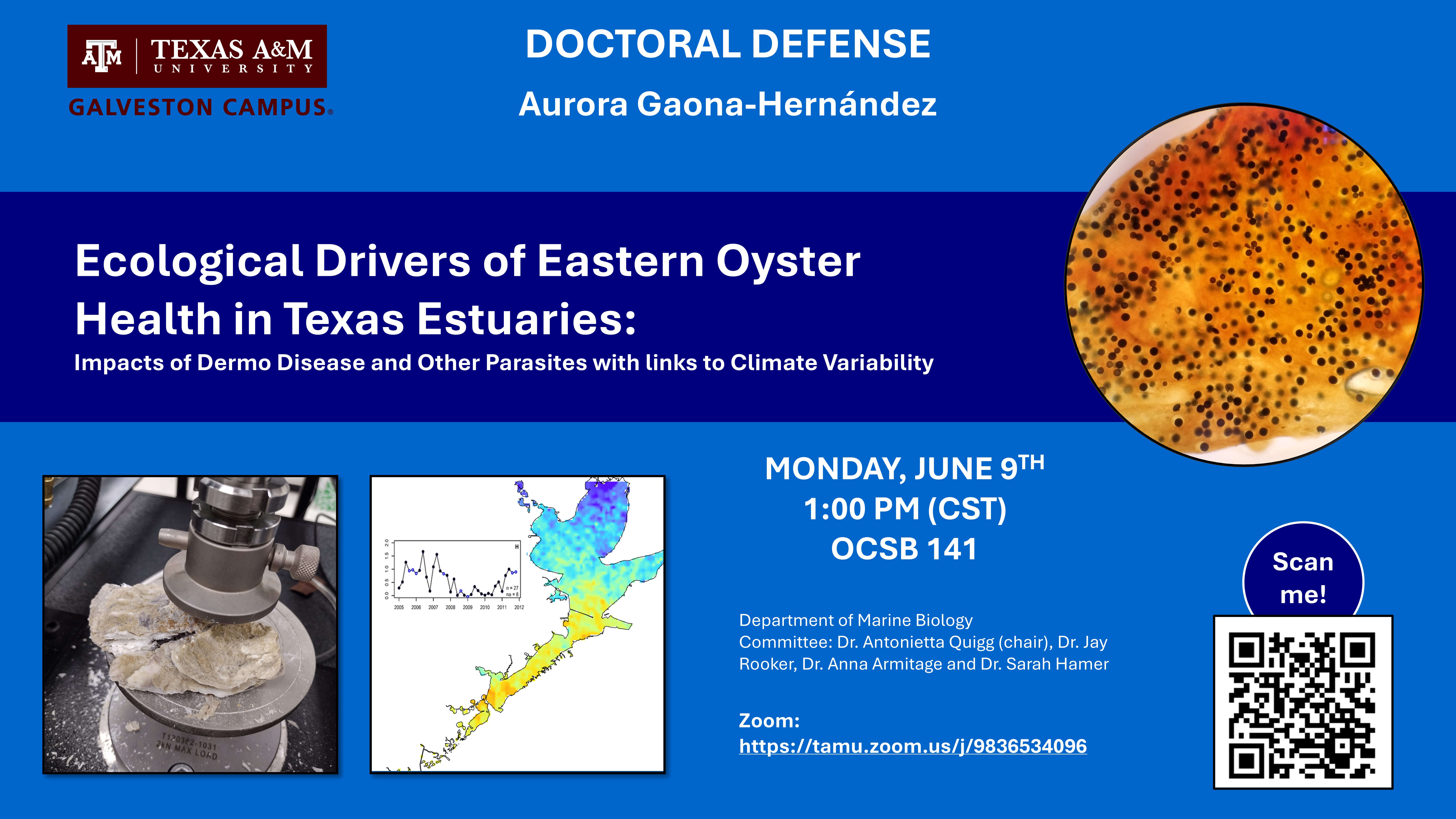 The first chapter of Aurora Gaona Hernandez (MARB PhD candidate) was recently published in the Journal of Shellfish Research (Spring Issue): https://doi.org/10.2983/035.044.0111. This paper addresses recent trends in parasite levels affecting oyster health in Galveston Bay, filling a critical seven-year data gap. Findings are particularly important given the potential for climate change to exacerbate conditions conducive to the reproduction of this parasite. Due to its contribution to the field, the paper has been nominated for the National Shellfisheries Association’s “Sandra E. Shumway Outstanding Student Paper” award.